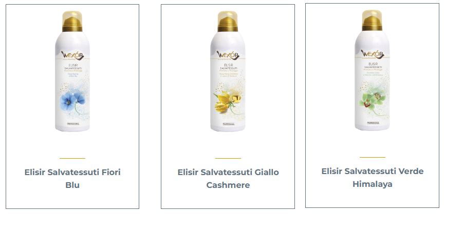 Elisir Salvatessuti Wexór è un deodorante per tessuti con formula professional che protegge e preserva gli indumenti e i tessuti d’arredo. Le sostanze “antiodore” di ultima generazione ne completano l’azione rendendolo unico e impareggiabile. La fragranza raffinata, intensa e preziosa conduce a sensazioni avvolgenti e inebrianti.